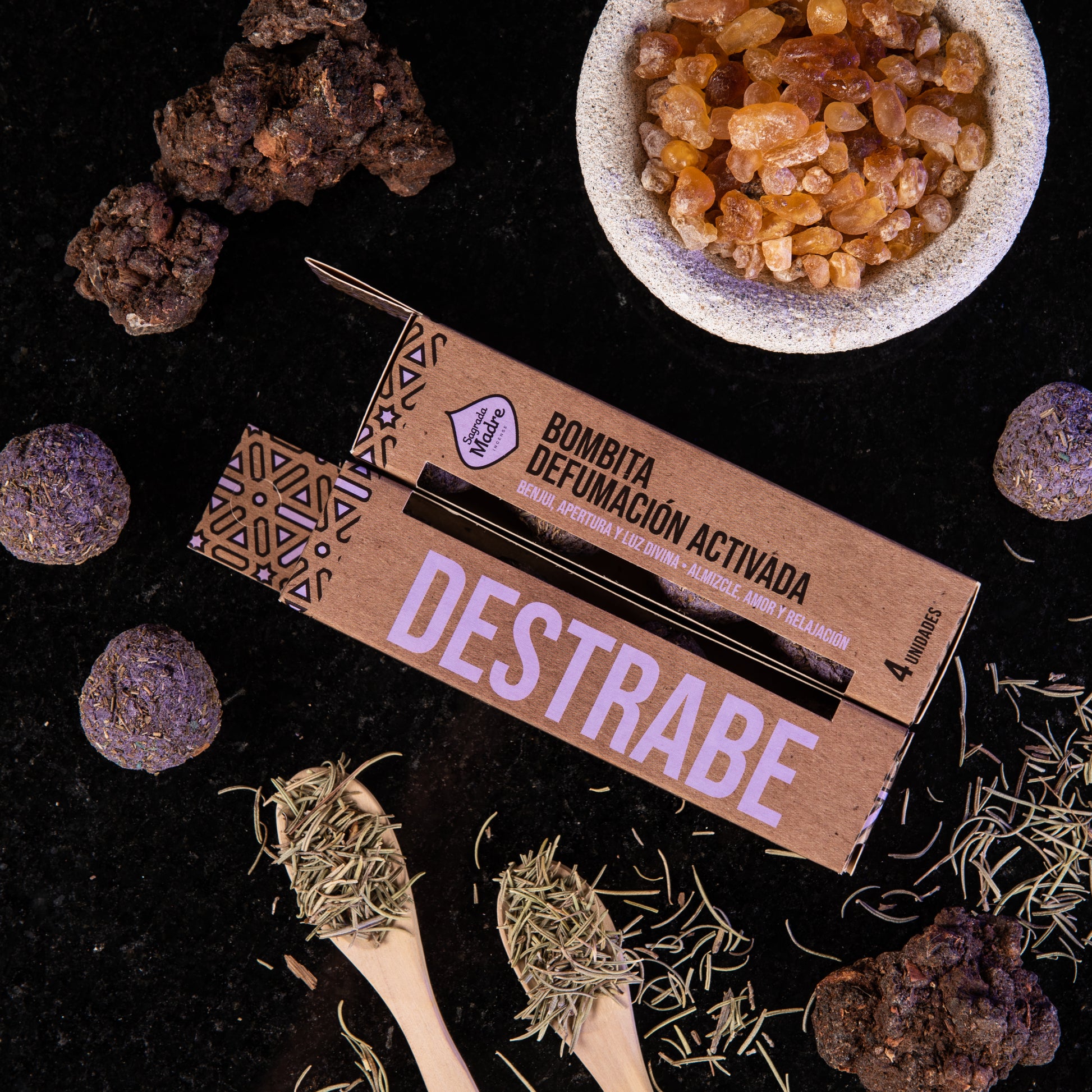 Cada caja incluye bombitas esféricas artesanales elaboradas con hierbas y resinas sagradas: