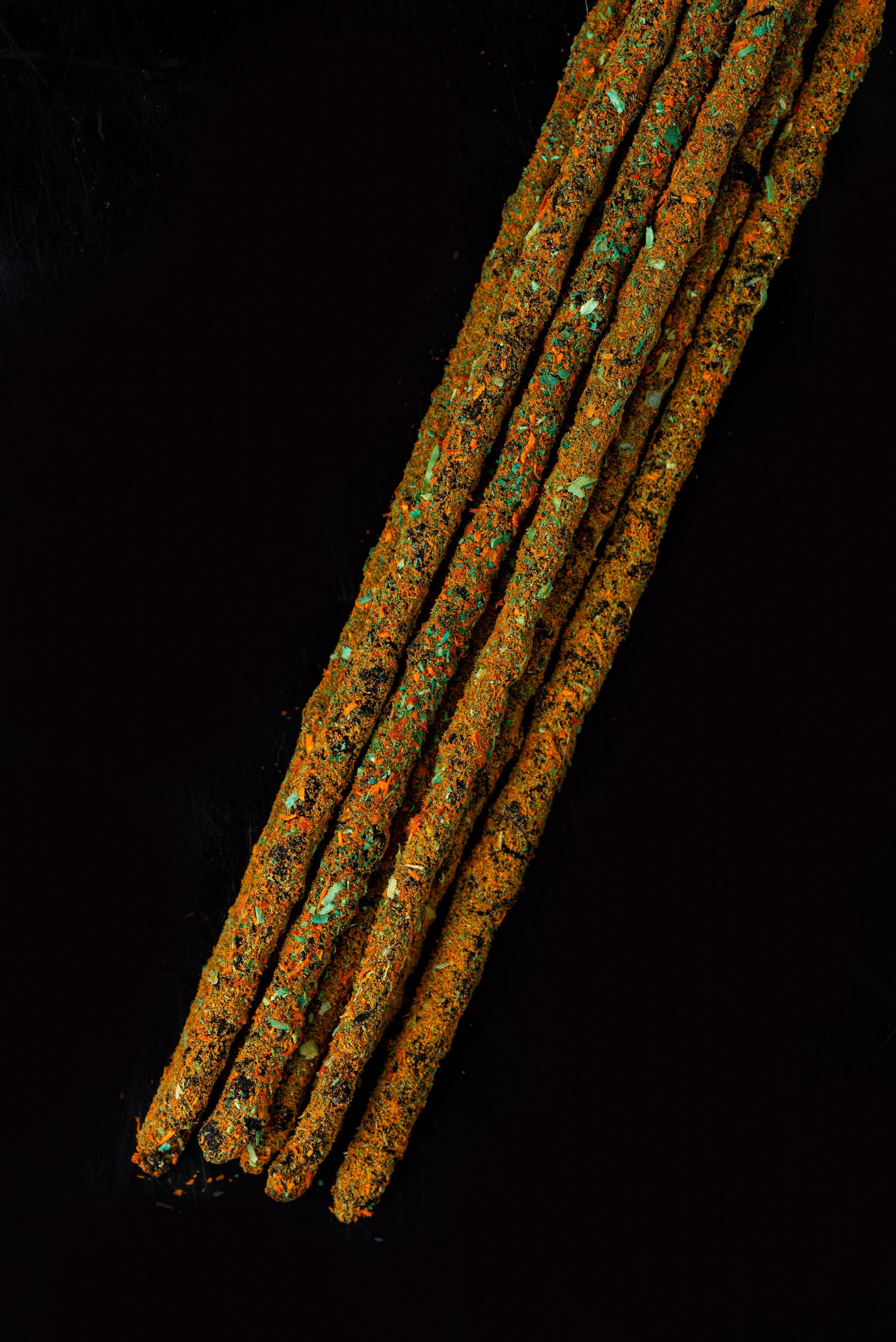 - Composición: Hierbas, resinas, cedro, carbón vegetal, biomasa de frutas, aglutinante natural y sal.