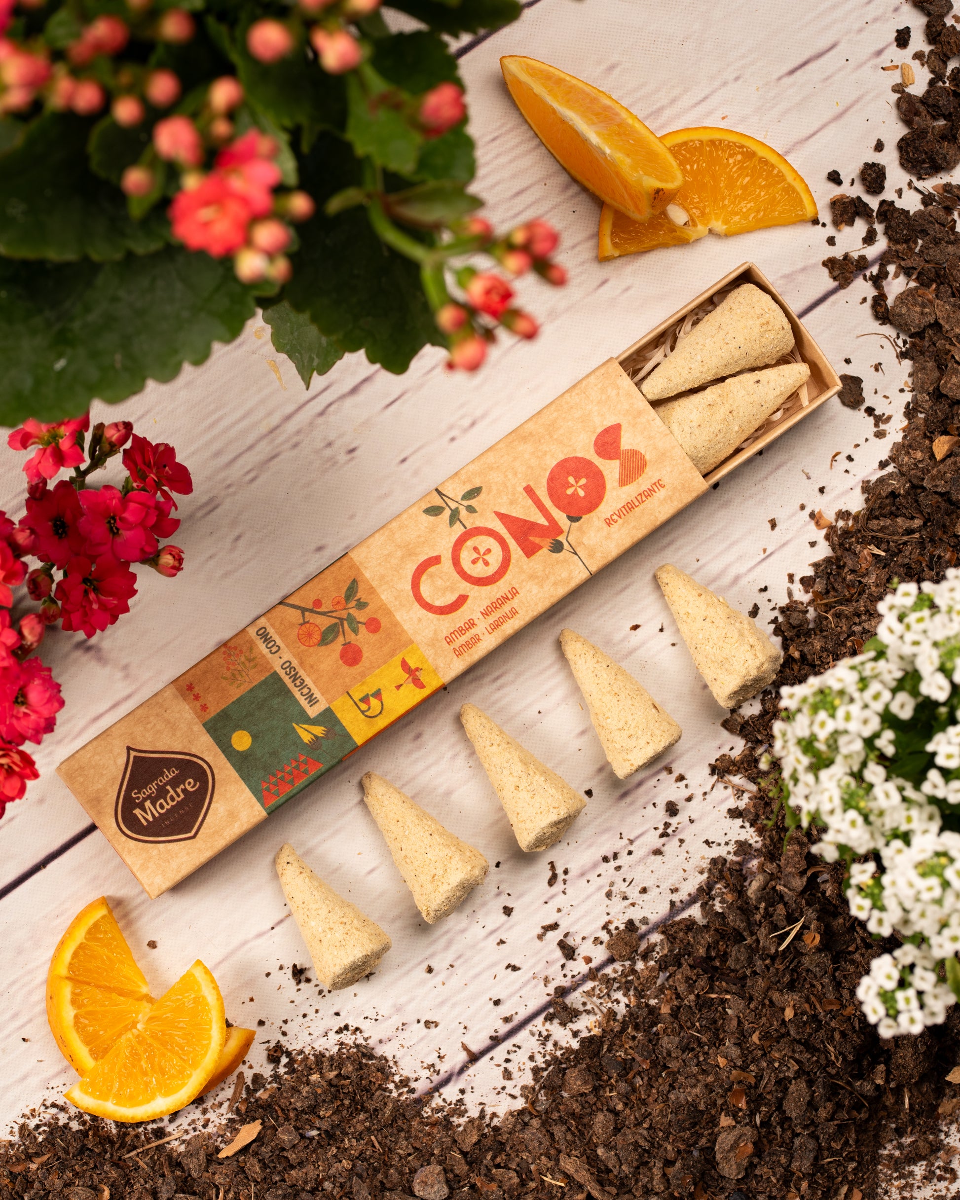 Los sahumerios en conos de Sagrada Madre están elaborados a base de biomasa de frutas, una alternativa sustentable que promueve el suprareciclaje y fomenta una conexión más profunda con la naturaleza. Al reutilizar los descartes de la industria de jugos y derivados, se reduce el desperdicio y se contribuye al cuidado responsable del medio ambiente.