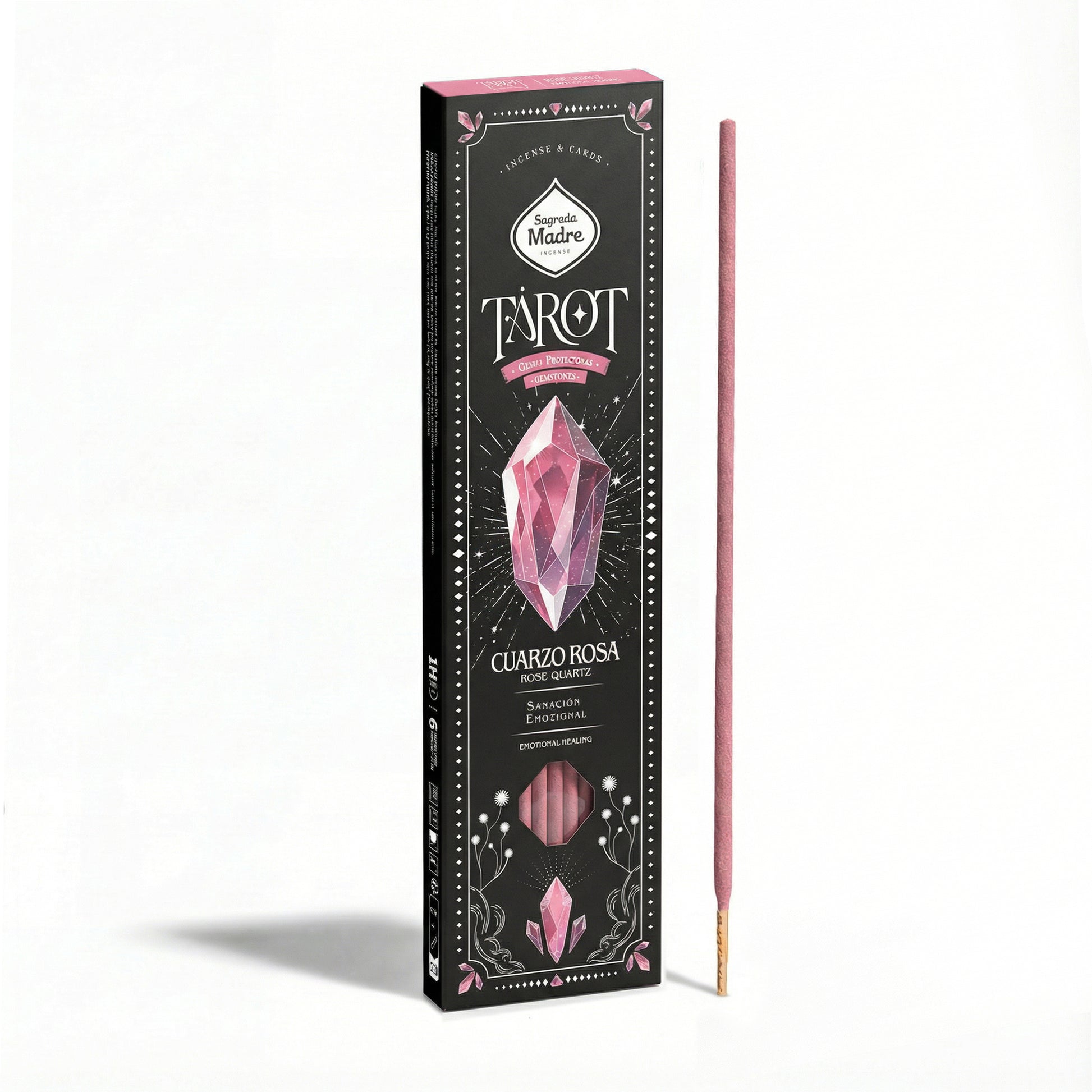 🔮💎 Sahumerio Tarot Gemas Cuarzo Rosa - Rosa Silvestre es un sahumerio para rituales de intención, con un toque único: incluye cartas de tarot con gemas sagradas para acompañar tu día. 🌿✨